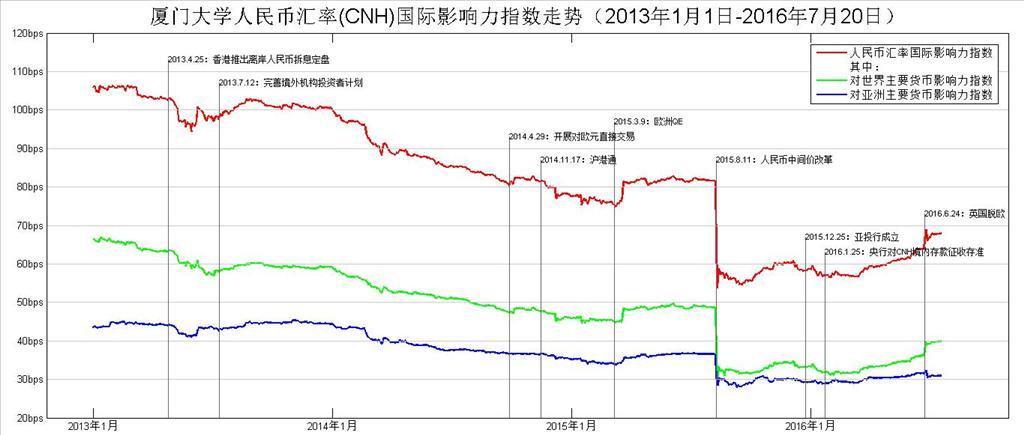 2016年6月6日厦大经济学科首次发布人民币汇率(CNY)国际影响力指数,就受到了社会各界的广泛关注。6月24日,厦大经济学科在与中国科学院预测科学研究中心联合主办的“金融风险量化与管理论坛”上正式发布了人民币汇率(CNY)国际影响力指数,及时反映英国“脱欧”导致人民币汇率的国际影响力大幅上升。7月21日,厦门大学经济学科新增发布离岸人民币汇率(CNH)国际影响力指数,回顾人民币汇改十一周年的市场化和国际化历程。人民币影响力指数是厦大研究团队运用定量分析进行经济系统数据分析的典范,运用现代计量经济学方法与工具,以数据分析为基础实证研究人民币汇率在国际上和亚洲地区的影响力,也可对人民币汇改等政策实施以及英国脱欧等重大国际事件的影响进行了定量评估,增强了经济政策建议的科学性,是建设具有中国特色、高水平的新型经济学智库的有益尝试。