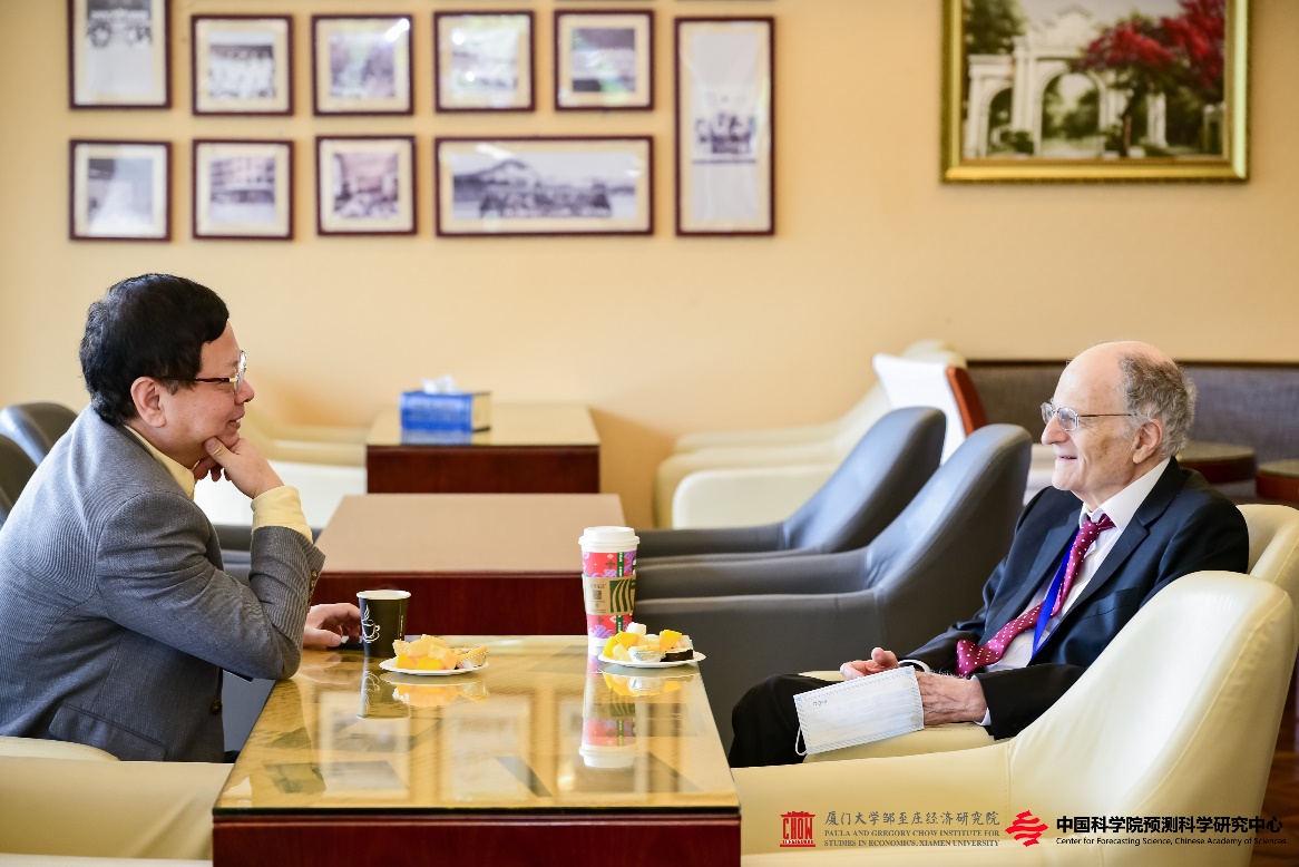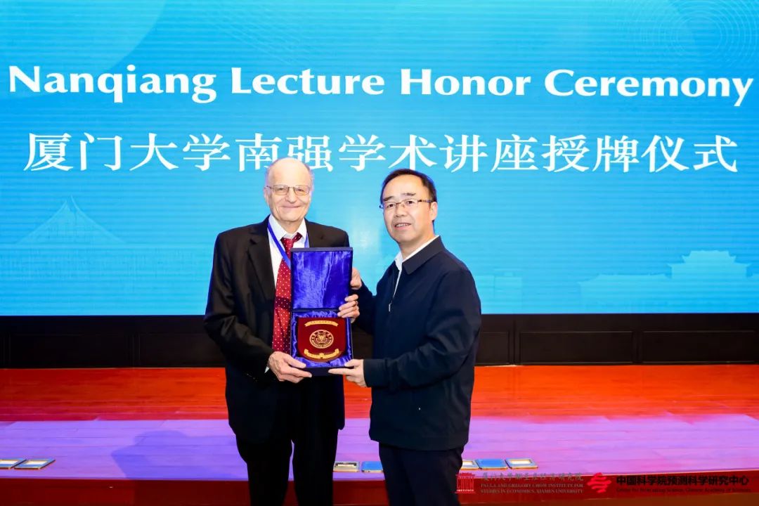 随后,张宗益校长为萨金特教授颁发厦门大学最高级别学术讲座——南强学术讲座纪念牌。