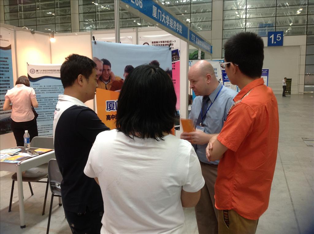 6月25日至26日,厦大经济学院国际教育合作中心在福州海峡会展中心参加了2013年福建高招咨询会暨国际教育展。项目合作院校之一的爱尔兰都柏林大学招生主管Geraldine McCarthy应邀出席此次参展。展览期间,考生及家长络绎不绝地涌入中心设立的展台并就1+3本科留学项目的相关内容进行咨询。现场气氛热烈,学生及家长与中心人员和外方代表互动交流的画面随时可见。不少家长表示此次咨询会为校方及考生提供了很好地沟通平台,考生能在第一时间内掌握有效而权威的资讯。
