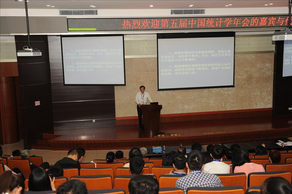 本届年会邀请了许宪春教授、崔恒建教授、肖红叶教授、邱东教授、Wolfgang Härdle教授、民生证券首席经济学家邱晓华教授、金勇进教授、谢邦昌教授、曾五一教授等九位统计学家(学者)作特邀报告。许宪春教授在题为《中国国民经济核算体系的修订及其意义》的报告中,对为什么要对现行国民经济核算体系进行修订、中国国民经济核算体系修订的重点内容以及中国国民经济核算体系修订的意义分别进行了详细的阐述。崔恒建教授在题为“Partial Penalized Likelihood Ratio Test for Sparse Case”演讲中,强调在大数据时代下,数据维数高并具有稀疏性,所以处理大数据时要特别抓住其高维、稀疏的特点,提出惩罚似然可以从原来的全惩罚修改为有选择的进行惩罚。肖红叶教授以《社会经济大数据信息的最优采集与有效使用问题研究》为题,围绕社会经济已进入大数据时代、对大数据的认知、经济主体市场行为信息决定的相关研究等进行演讲。邱东教授在题为《经济测度的可加性问题》的演讲中,主要探讨了实物、价值以及合成人类三大指标加总方式以及经济社会测试中的“可加性问题”,指标口径、价格信号、“当量转换”等,并得出了关乎指标可靠性的结论:“计量须较质”。Wolfgang Härdle教授发表了题为“TEDRIS-Tail Event Driven Risk Structures”的报告,具体介绍了尾事件的七个不同项目及技术处理细节。邱晓华教授在题为《新常态、新视野、新趋势――中国经济分析与展望》的演讲中表示,中国经济告别了两位数高速增长,进入一位数中高速增长,增长趋势并没有完全逆转,经济还有一定的增长惯性,经济增速不会断崖式下滑。金勇进教授在题为《我国企业创新调查抽样方案设计》的报告中,围绕“调查背景”、“精度与样本量”、“样本量分配”、“样本抽取”、“样本追加”、“关于估计”等六个方面进行阐述。谢邦昌教授在题为《云计算在大数据时代统计研究发展重要性》的演讲中,介绍了大数据发展的现况与未来发展趋势,以及大数据带来结构性变革。曾五一教授在题为《关于统计学专业教学质量国家标准的若干问题》的报告中,介绍了制订教学质量国家标准的意义、进展情况以及主要内容等。