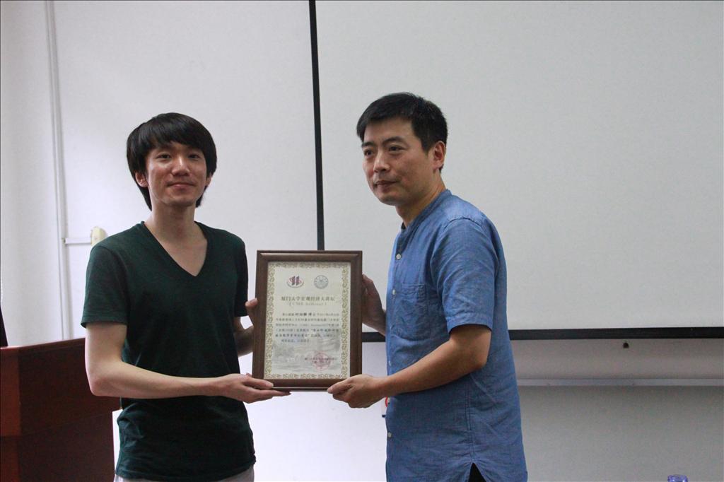 最后,柯绍韡现场解答了部分研究生论文写作中的困惑,并与在场师生交流了经济学理论研究的相关议题,现场气氛十分热烈。宏观经济研究中心研究员、经济学院教授邵宜航主持本次讲座,并为柯博士颁授CMR Seminar纪念牌。
