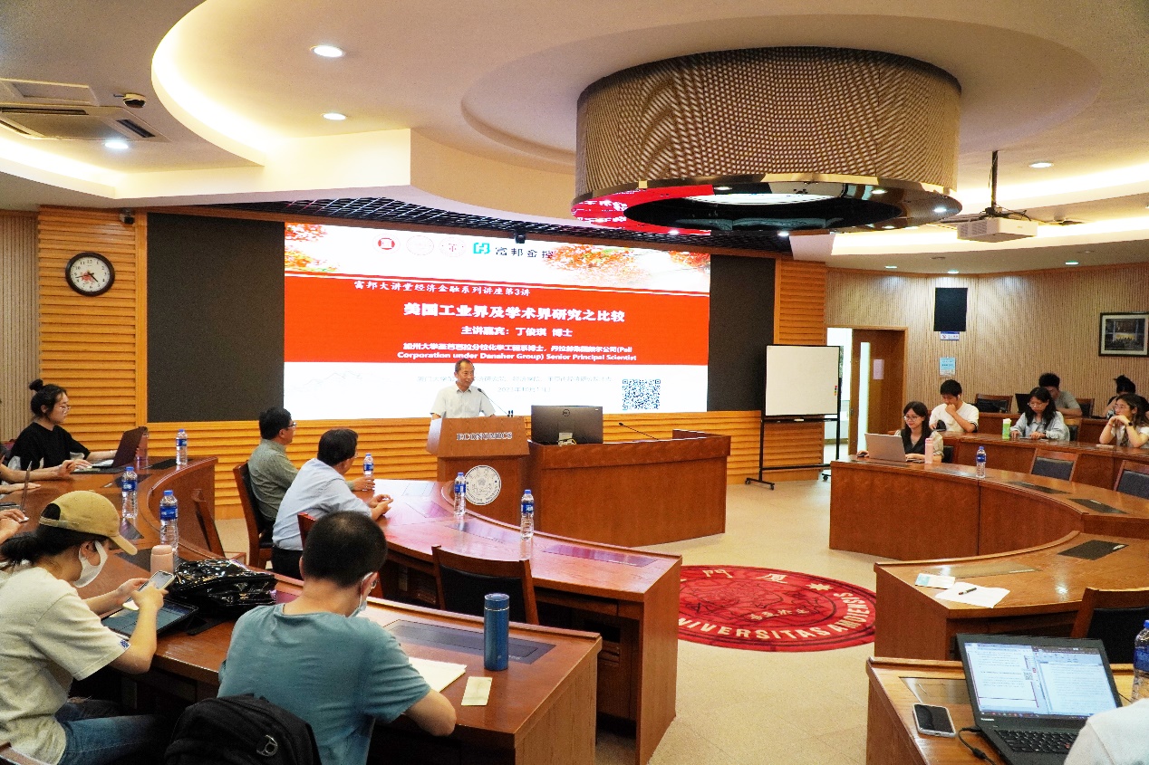 10月13日下午,厦门大学富邦大讲堂经济金融系列讲座在厦大经济楼C208报告厅举行,厦门大学校友、丹拉赫集团颇尔公司资深首席科学家(Senior Principal Scientist)丁俊琪博士开讲“美国工业界及学术界研究之比较”。