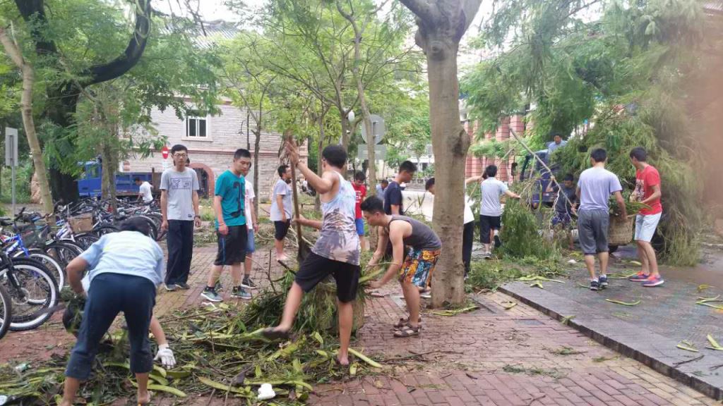 台风莫兰蒂袭击厦大,一夜之间,美丽校园一片狼藉,不少参天大树被连根拔起,路面狰狞外翻。两院学院师生迅速反应,在学院领导的带领、辅导员老师的组织下,抗台救灾的学生志愿者达1000余人次,其中包括以约麦尔·阿卜拉同学为代表的少数民族学生10余人、以吕超群同学为代表的海外留学生10余人。学院采购清洁工具40套、垃圾袋10大卷、胶带1200多卷,抢修被雨水倒灌的宿舍、用胶带加固被风吹破的阳台门和窗户、在芙蓉三被大树压坏的阳台等危险地方拉起警戒线,负责学院、宿舍园区等学校公共区域等共计10余个片区的卫生工作,清理落叶及垃圾近100袋,扶正自行车约300台。