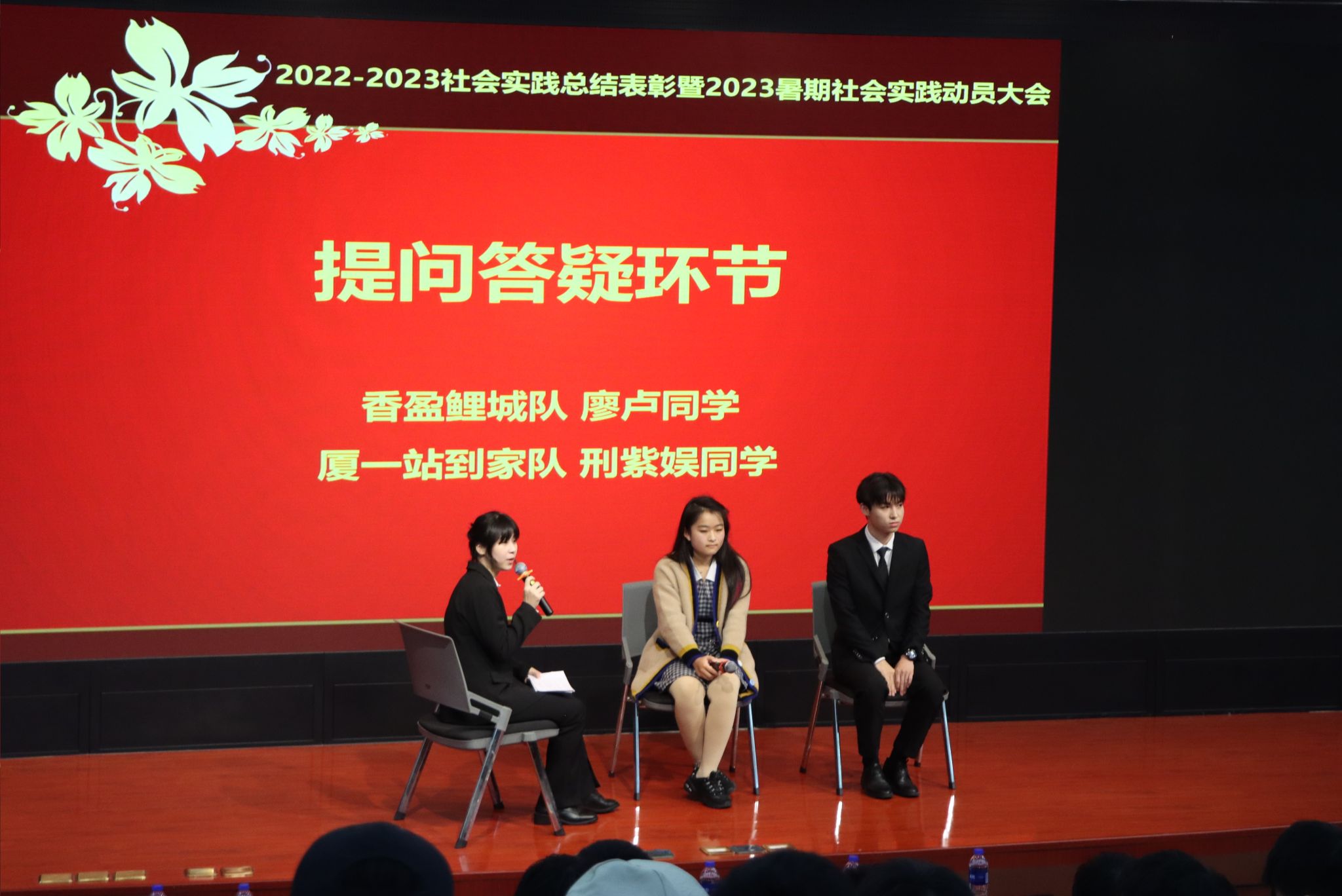 大会最后进行了活泼有趣的“走进实践”环节。优秀实践队“香盈鲤城”代表廖卢同学和“厦一站到家”代表刑紫娱同学接受采访与提问,他们将实践开展流程与团队成功的经验娓娓道来,在主题确定、时间协调、任务分配方面的宝贵经验为接下来的社会实践队伍提供了有效的帮助。