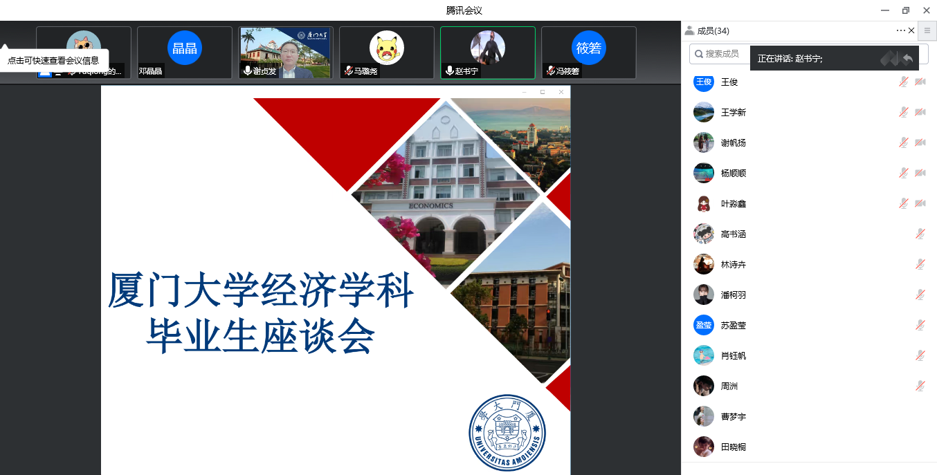 厦大经济学科根据厦门大学《关于开展本科教育教学审核评估自评工作的通知》部署,积极开展审核评估的自评和自建工作。为了更好推进经济学科人才培养,了解毕业生升学、就业需求,2月22日晚,经济学院、王亚南经济研究院(WISE)召开经济学科毕业生线上座谈会。会议由经济学院副院长谢贞发主持,各系本科分管领导、辅导员、本科部教学秘书参会。