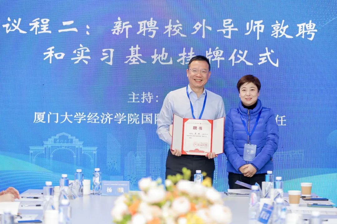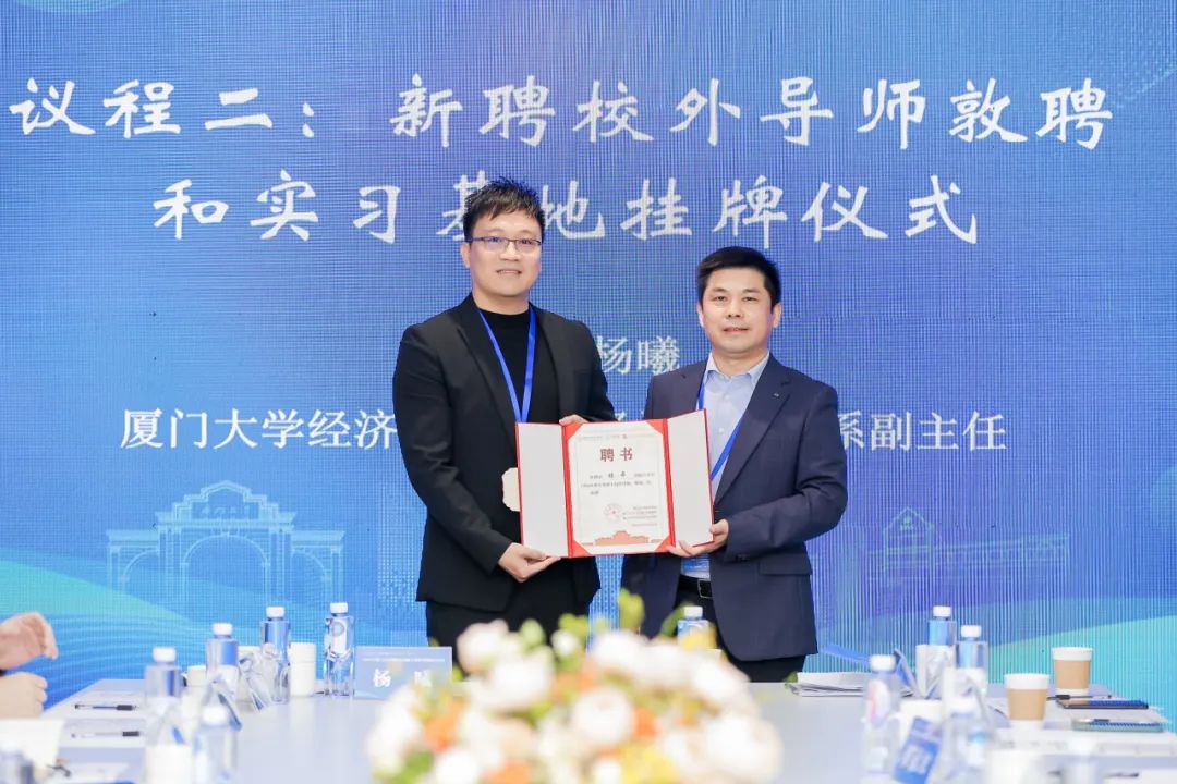 开幕式后,经济学院党委副书记李静、经济学院副院长彭水军教授分别为新聘校外导师——成畦资本创始合伙人林舜,厦门金融租赁有限公司总裁吴稷颁授聘书。