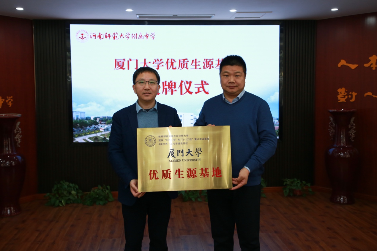 随后两天,厦门大学河南招生宣传组一行人分别前往郑州外国语学校、河南省开封高级中学、商丘市第一中学、河南师范大学附属中学和新乡市第一中学共五所中学开展交流座谈和优质生源基地授牌仪式。交流过程中,厦门大学河南省招生宣传组详细介绍了厦门大学概况、经济学科发展情况,双方就人才培养、发展现状和考录情况等方面进行了交流。黄鸿德老师和谢贞发老师分别代表厦门大学为五所中学授予“厦门大学优质生源基地”牌匾,对五所中学为厦门大学源源不断输送优质生源学子表示肯定和感谢,期待五所中学与厦门大学经济学科能有更多深入的交流与合作。