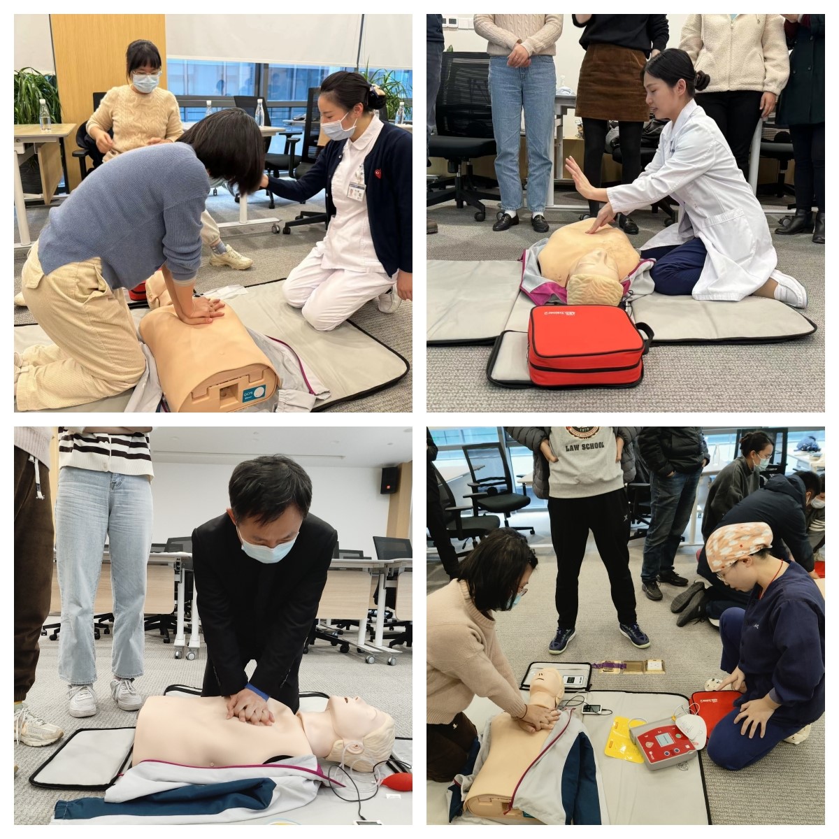 随后,“厦心”医护人员以理论、实操相结合的方式为大家培训。医护人员讲解了心肺复苏的操作步骤、动作要领和注意事项,以及AED的使用方法。在医护人员的现场指导下,经济学科行政技术团队利用模拟假人开展了心肺复苏实操演练,包括评估患者、胸外按压、人工呼吸、AED使用等,通过多次演练与指导,大家熟悉了具体的急救姿势和动作要领。参训培训的教职工李老师表示,“经常看新闻说有心脏骤停的意外事件,但完全不知道如何处理,更不会使用AED,今天学习了这些关键技能,以后碰到类似事件也能为身边人的安全尽一份力。”