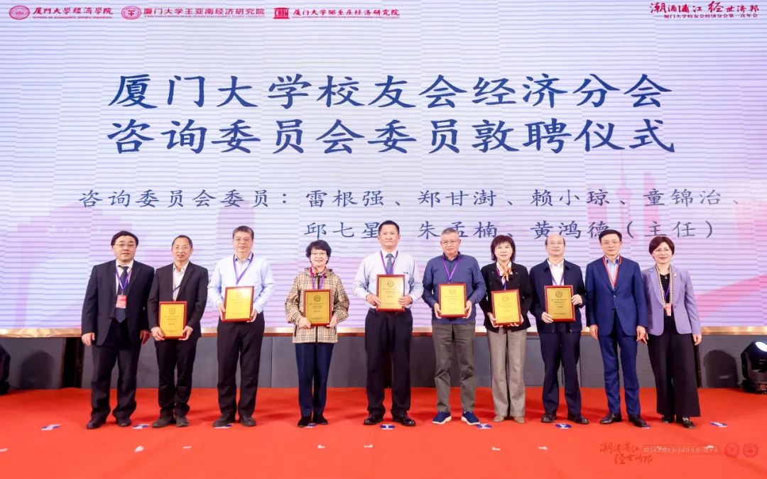 敦聘咨询委员会仪式上,经济分会敦聘厦门大学黄鸿德、邱七星、雷根强、朱孟楠、赖小琼、郑甘澍、童锦治7人为咨询委员会委员,万建华、厦门大学校友总会秘书长王智兰、周颖刚为委员颁发敦聘聘书。