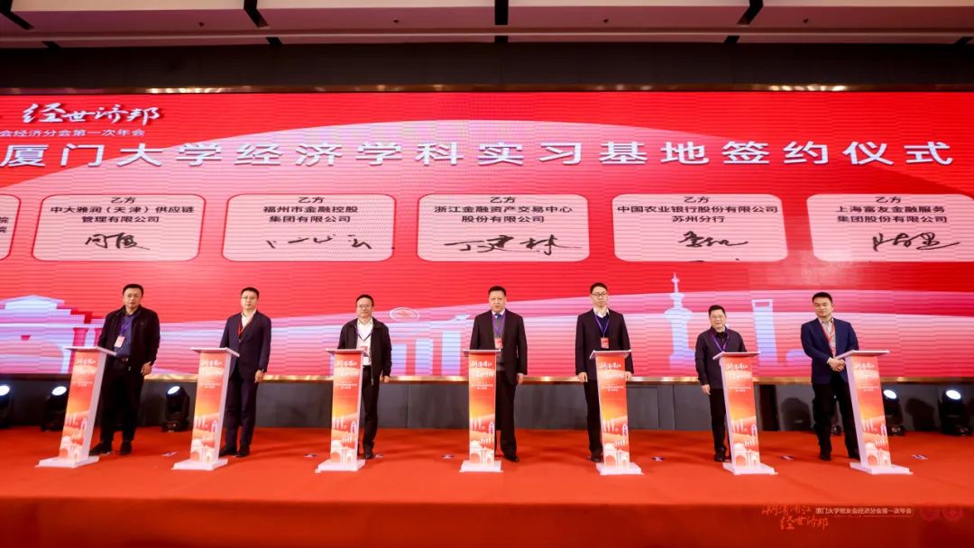 在实习基地签约仪式上,厦门大学王亚南经济研究院副院长王艺明代表厦大经济学科,与浙江金融资产交易中心股份有限公司董事长丁建林,中国农业银行股份有限公司苏州分行人力资源部副总经理李凯,福州市金融控股集团有限公司董事长叶发强,上海富友金融服务集团股份有限公司董事长陈建,容诚会计师事务所合伙人涂振连,中大雅润(天津)供应链管理有限公司董事长周厦等院友和代表签约。