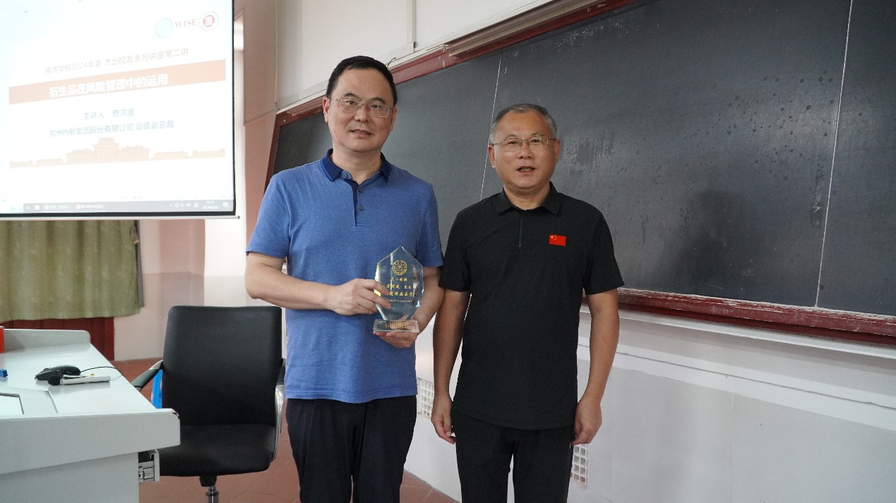 6月28日下午,厦大经济学科2024年夏季学期杰出校友系列讲座第二讲在群贤二102教室顺利举行,热联集团高级副总裁、中金协风险管理专委会会长劳洪波应邀作了题为“衍生品在风险管理中的应用”的精彩讲座。经济学院党委书记高忠华出席讲座并为主讲人颁授讲座纪念牌。