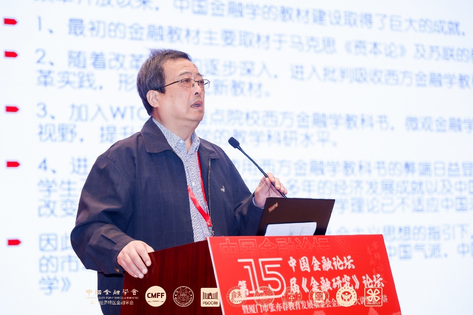 刘锡良的演讲主题为“金融学研究的几点思考”,通过回顾近年主持编写《中国金融学》教材的过程,刘锡良教授认为,以马克思主义理论为指导,现代市场经济的一般原理与中国社会主义实践的结合是构建《中国金融学》理论基础的关键所在。在马克思主义思想指导下,学习借鉴现代西方市场经济理论,并结合中国国情,在此基础上进行创新探索,不能照搬市场经济理论,必须注意中国社会主义市场经济与发达国家市场经济的差别:一是金融微观主体以国有为主,与其他市场经济国家存在显著差异;二是政府在资源配置上仍发挥重要作用,需要平衡政府与市场的关系;三是金融运行目标体现了以人民为中心的价值取向,注重社会公平和共同富裕。