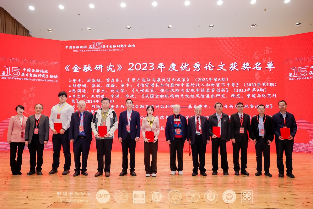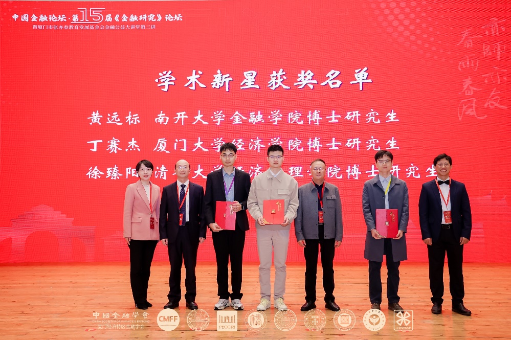 会上还举行了《金融研究》2023年度优秀论文奖和学术新星奖的颁奖仪式(名单附文后)。厦门大学社科处处长、文科期刊中心主任、经济学院金融系主任潘越教授宣布获奖名单,张亦春、白钦先、莫万贵、吴超鹏、姚余栋、陈道富等为获奖者颁奖颁奖。张亦春基金会理事长郑学军、副理事长朱孟楠、理事刘自力为南开大学金融学院博士研究生黄远标,厦门大学经济学院博士研究生丁赛杰,清华大学经济管理学院博士研究生徐臻阳颁发学术新星奖。厦门大学经济学院党委书记高忠华向张亦春基金会授予“厦门大学财金校友之家”牌匾。