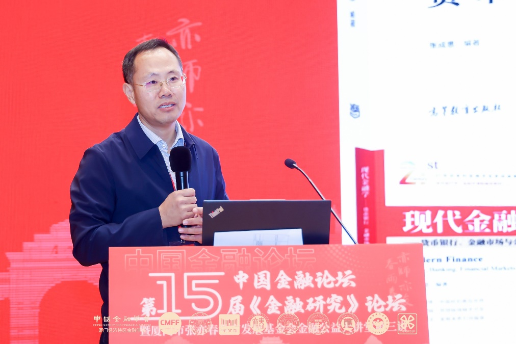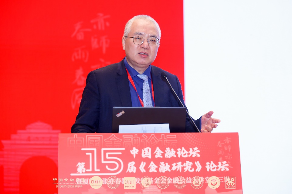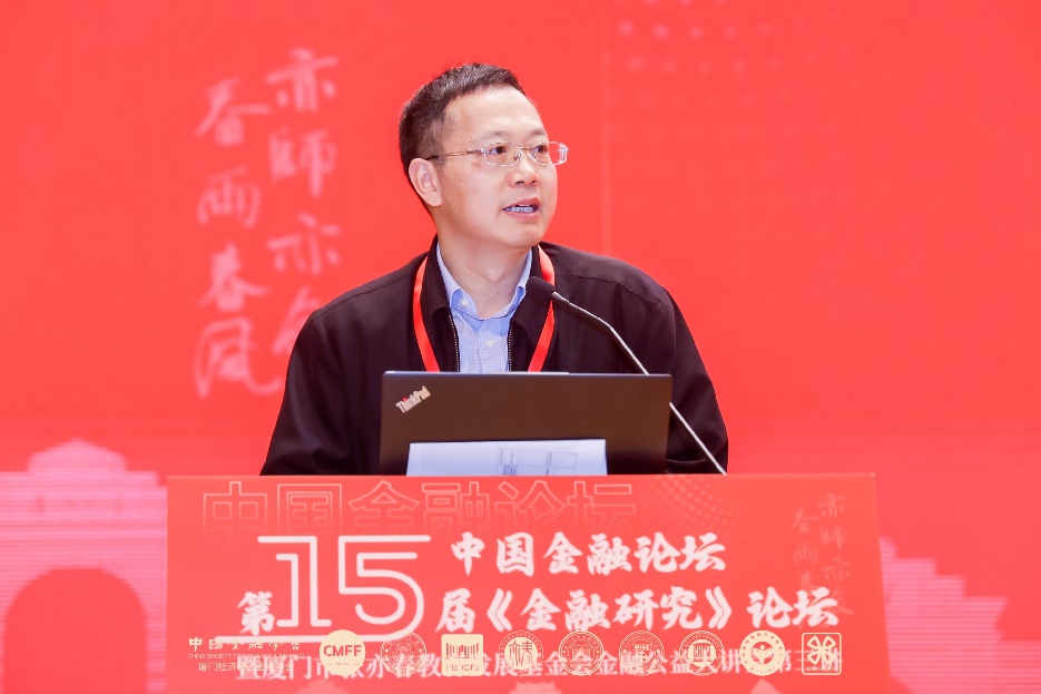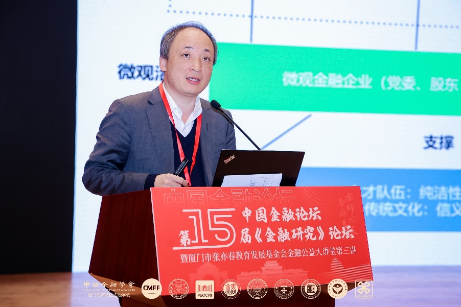 陈道富发表了题为“中国特色金融的现代化实现路径思考”的主旨演讲。他首先从金融工作的论述总结出中国金融的特色,尤其是微观主体的特点。其次从历史进程、范式转换和中国新时代中寻找现代金融体系的内涵。最后就如何实现中国特色金融的现代化提出了框架性建议,包括如何平衡金融的政治性、人民性与金融市场规律,如何实现半开放微观金融机构下的合理治理和能力体系建设,如何确保正当规则和市场秩序等。