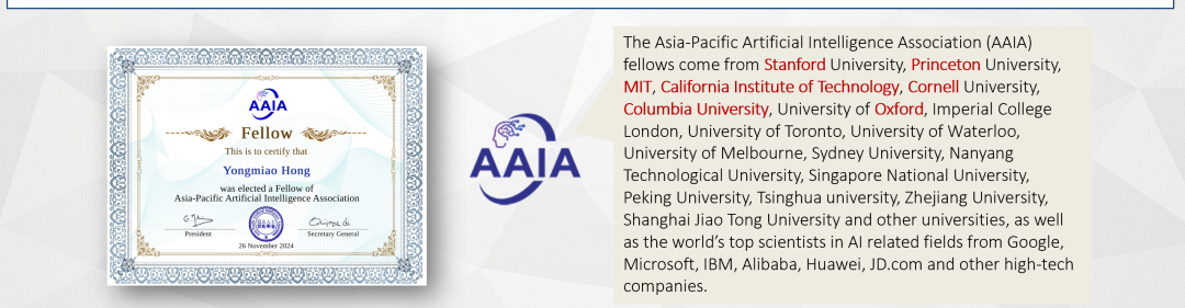 自2023年初大语言模型在应用端“破圈”以来,厦大经济学科敏锐认识到人工智能技术、特别是大模型对经济学与社会科学研究范式将产生深远影响。积极拥抱这一技术浪潮,洪永淼教授团队发表了一系列关于计量经济学方法论、经济学研究范式变革与学科发展的思想性文章,积极探索大数据与人工智能对经济学研究范式的影响,相关研究发表在《管理世界》《中国科学院院刊》《中国科学基金》《计量经济学报》等学术期刊。鉴于在“在人工智能对经济学研究范式影响领域的杰出成就(outstanding achievements in the area of artificial intelligence impact on the paradigm of economic research)”,2024年11月,洪永淼教授被推选为亚太人工智能学会(Asia-Pacific Artificial Intelligence Association, AAIA)会士(Fellow)