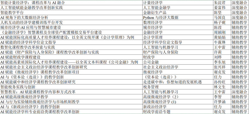 在课程建设方面,经济学科积极落实国家教育数字化战略行动,推动AI赋能教育教学转型,提升课程建设质量,强化学生高阶思维能力的发展培养,积极开展AI赋能课程教学改革创新工作。在首批校级AI赋能课程教学改革项目中,获立项23项,占全校比16%,名列前茅。