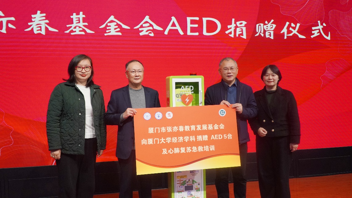 大会上举行了张亦春基金会AED(自动体外除颤仪)捐赠仪式。作为急救设备,AED能在关键时刻为生命保驾护航。张亦春基金会怀着对教育事业的热忱和对师生的关爱,向经济学科捐赠了5台AED设备,目前设备已分布在了经济楼以及经济学科集中住宿的宿舍楼。张亦春教育发展基金会理事长郑学军、秘书长钟妙云上台颁赠仪器,经济学院党委书记高忠华、邹至庄经济研究院副院长余安旖代表学院接受捐赠。郑学军在随后的发言中表示,很高兴与厦大经济学科一起,将慈善工作有力推进。