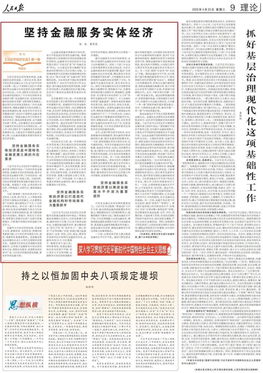 4月23日,厦门大学经济学院、王亚南经济研究院教授蔡熙乾和清华大学五道口金融学院讲席教授陆毅在《人民日报》2025年4月23日第9版(理论版)上发表题为《坚持金融服务实体经济》的署名文章。现将全文转载如下,以飨读者。