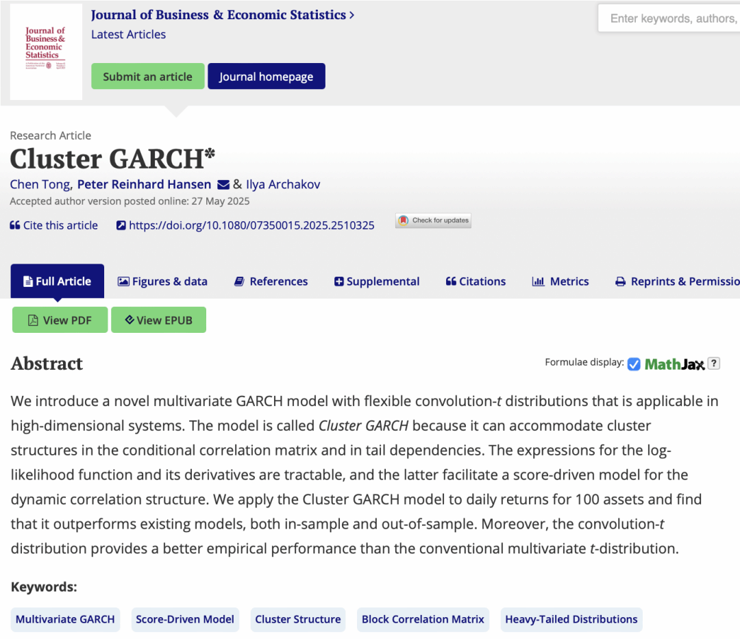 近日,厦门大学经济学院金融系与王亚南经济研究院童晨副教授,与美国北卡罗来纳大学教堂山分校Peter Reinhard Hansen教授、加拿大约克大学Ilya Archakov助理教授的合作论文“Cluster GARCH”被统计学与计量经济学国际权威期刊Journal of Business & Economic Statistics正式接收并在线发表。该期刊是厦门大学经济学科认定的国际A类期刊。