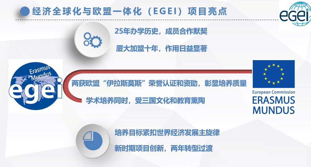 2011年,厦门大学成为欧盟“伊拉斯莫斯全球化与欧盟一体化(EGEI)”联合培养硕士项目联席学校,是国内唯一参加的大学。该项目是欧洲高水平、高标准、跨文化教育合作的典范。项目由全球九大高校联盟,面向全世界招收优秀青年学生进行经济学硕士培养。进入该项目的学生在一年内,分别到三个不同国家高校接受经济学专业学术训练。已有20余名经济学科学生参与该项目。2019年7月,该项目获得国家留学基金委“国家创新型人才国际合作培养项目”批准资助。入选学生可获得国家留学基金委的资助。