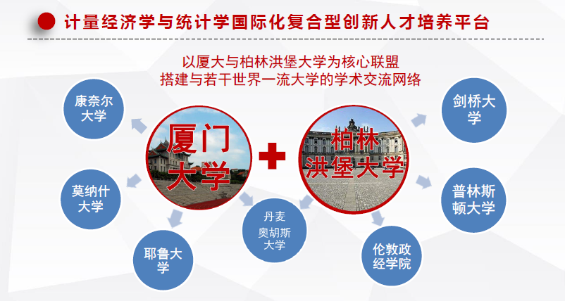 2018年1月,计量经济学教育部重点实验室(厦门大学)与德国洪堡大学应用统计学和经济学研究中心合作开展的“计量经济学与统计学专业创新型人才项目”获得国家留学基金委“创新型人才国际合作培养项目”批准资助,该项目是厦门大学王亚南经济研究院与德国洪堡大学经济管理学院联合培养博士生项目(International Research Training Group,IRTG)的延续与拓展。入选学生可获得国家留学基金委的资助。