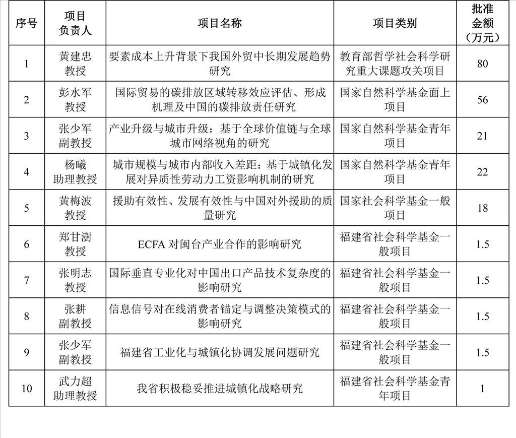在学校社科处、科技处和经济学院的大力支持下,经过国际经济与贸易系全体师生的共同努力,2013年度我系纵向课题的申报和立项喜获丰收。截至9月26日,立项数、批准金额创历史新高,立项总数达10项,其中教育部哲学社会...