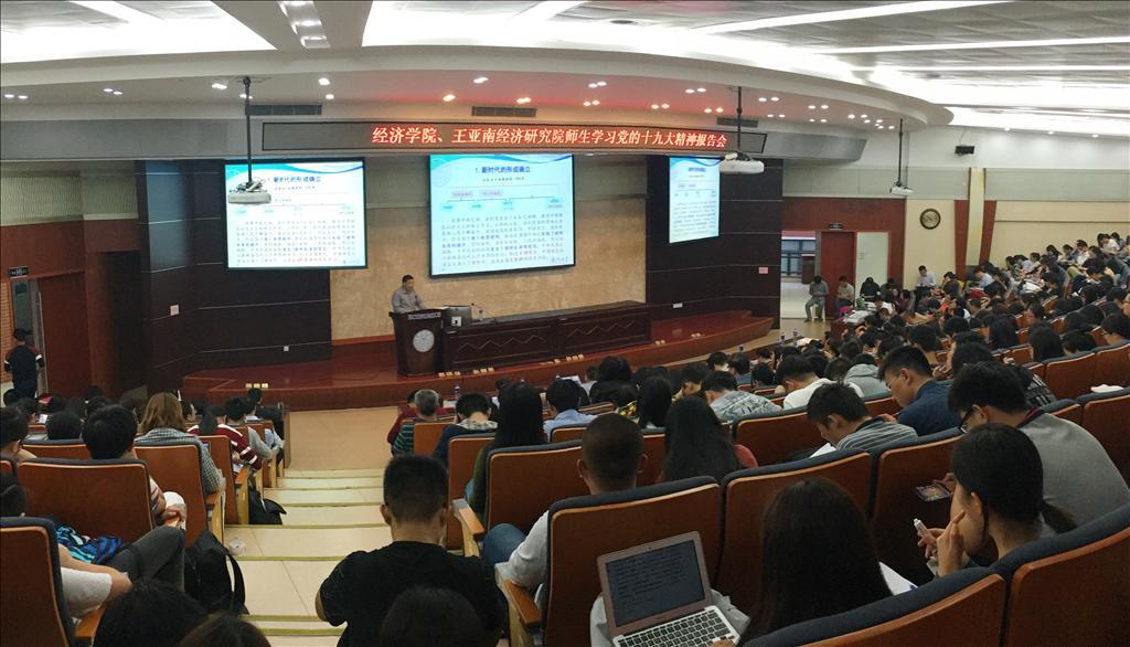 11月6日下午,经济楼N402,学院党委邀请学校理论报告员苏劲教授为经济学院、王亚南经济研究院(以下简称“两院”)师生作学习解读党的十九大精神报告。两院党政领导和师生代表400余人参加了报告会,学院党委书记雷根...