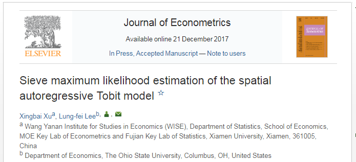 近日,厦大经济学科青年教师许杏柏与美国俄亥俄州立大学经济学讲席教授李龙飞合作撰写的论文“Sieve Maximum Likelihood Estimation of the Spatial Autoregressive Tobit Model”,在线发表于计量经济学国际顶级学术...