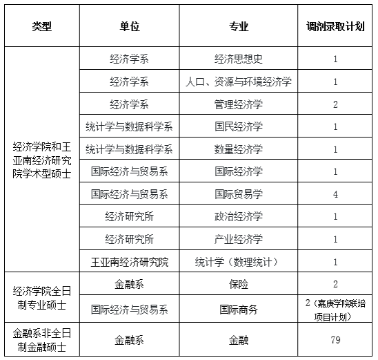 1.经济学院和王亚南经济研究院上线生源不足的专业从厦门大学经济学院、王亚南经济研究院和邹至庄经济研究院入围一志愿复试考生中调剂。学术型考生和专业硕士考生可分别在本类型专业内申请调剂;学术型考生可以申请调剂至专业硕士,但是专业硕士考生不能申请调剂至学术型;经济学院全日制金融硕士考生只能申请调剂至经济学院非全日制金融硕士。调入专业与第一志愿报考专业需在同一学科门类范围内。统计学(数理统计)专业考生仅能参加同专业的调剂。