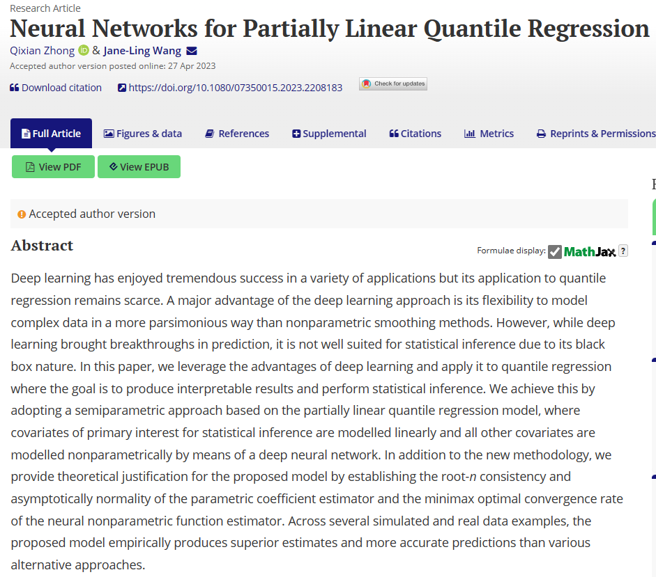 近日,厦大经济学院统计学与数据科学系、王亚南经济研究院助理教授钟齐先与美国加州大学戴维斯校区Jane-Ling Wang合作完成的论文“Neural Networks for Partially Linear Quantile Regression”在统计学与计量经济学国际权威期刊Journal of Business & Economic Statistics上在线发表。