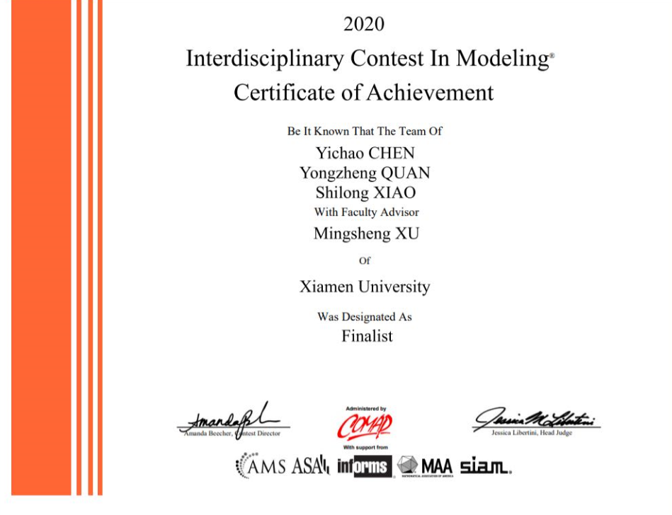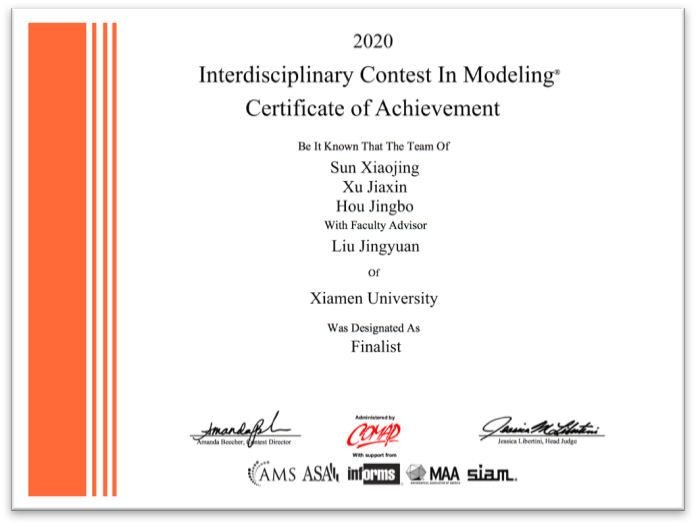 此次大赛中,有两组由经济学院本科生组成的队伍获奖,一组由经济学院大二本科生孙小鲸(18级数理统计国际化试点班)、徐嘉欣(18级金融国际化试点班)、侯景博(18级数理统计国际化试点班)三人组成,指导老师为厦大经济学院统计系与王亚南经济研究院(WISE)副教授刘婧媛;一组由经济学院肖世龙(18级国际商务国际化试点班)、数学科学学院陈贻超、管理学院全泳铮组成,指导老师为厦大经济学院徐明生助理教授。两支有经济学院本科生参与的队伍从全球2万多支参赛队伍、7万余名参赛者中脱颖而出,荣获“特等奖提名奖”(Finalist, F奖),该奖项获奖比例仅为约0.2 %。