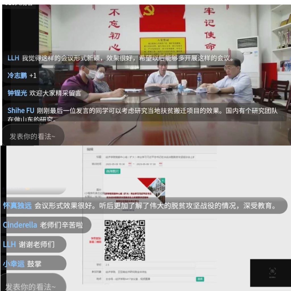 今年是决胜全面建成小康社会、决战脱贫攻坚之年。为深入传达学习习近平总书记在决战决胜脱贫攻坚座谈会上的重要讲话精神,经济学院党委于5月9日下午精心组织了一场中心组(扩大)暨师生双周政治理论“云”学习。本次学习以线上线下相结合的方式开展,设经济学院A417会议室为主会场,N203会议室作为学院集中观看点,并通过随会、zoom以及微信同步直播。本次学习由经济学院党委副书记周蕾主持,经济学院和王亚南经济学院师生共同参与。