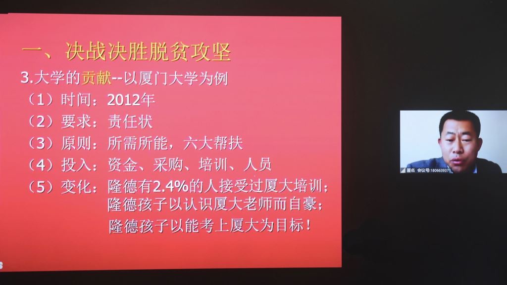 接着,我校正在宁夏固原市隆德县挂职县委常委、副县长的马龙同志与经济学院党委副书记杜海林同志(曾于2016年至2018年挂职宁夏固原市隆德县委常委、副县长)分别以《摆脱贫困 六盘山上高峰》和《这些年,厦大在宁夏隆德一直做着这样一件事》为题,深入解读了贫困的标准,脱贫的目标任务,展现了隆德县在开展脱贫攻坚中旧貌换新颜的显著成效,全面梳理了厦门大学在医疗、教育、智力、科技、产业、文化等六个方面为助力隆德打赢脱贫攻坚战所做出的贡献,并分享了个人在脱贫攻坚一线的工作思考与体会.