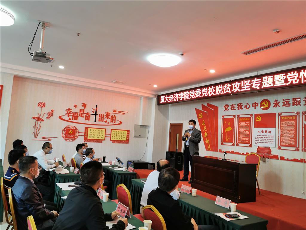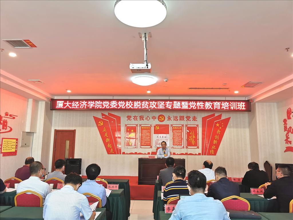 随后,黄鸿德为学员讲授专题党课。他提到,定点扶贫隆德是党中央、国务院交给厦门大学的光荣使命。厦门大学经济学院党委深入学习贯彻习近平总书记关于扶贫工作的重要论述,深度融入闽宁协作大局。希望通过此次脱贫攻坚专题暨党性教育培训,能让大家更加深刻地领会打赢脱贫攻坚战的重大意义。学员们要充分发扬经济学科服务社会的精神,通过发挥自身专业特长,为隆德县脱贫攻坚事业贡献经济学科的智慧力量。他讲到,贯彻落实新时代党的组织路线,打造坚强有力的高校教工党支部是高校党建的重要内容,希望大家能在本次培训中,交流经验,梳理思路,把党支部打造成坚强有力的战斗堡垒,为实现学校“两个一百年”奋斗目标保驾护航。