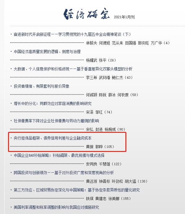 近期,厦门大学经济学院金融系郭晔教授与暨南大学金融系黄振副教授(第一作者)合作完成的论文“央行担保品框架、债券信用利差与企业融资成本”在《经济研究》2021年第1期正式刊出。