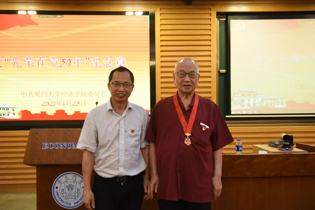 首先,经济学院党委书记黄鸿德为张亦春教授颁发“光荣在党五十年”纪念章。