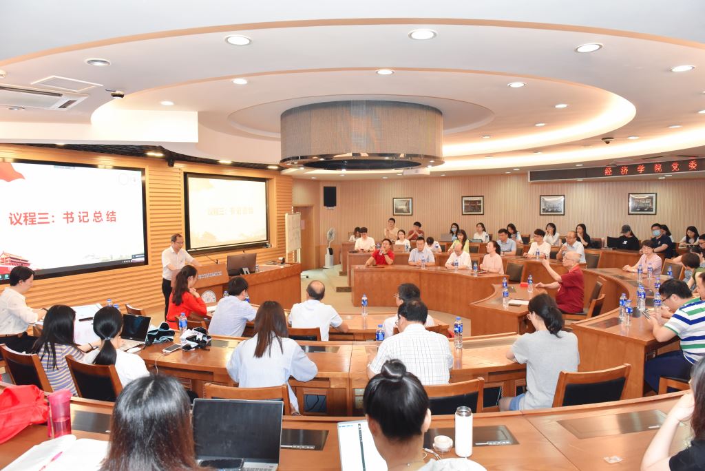 “红梅花儿开,朵朵放光彩……”6月23日中午,经济学院C208教室红歌飘扬、激情澎湃,这是经济学院党委第一期“师说百年·红色引航”师生共建党支部示范党课观摩点评会活动现场。著名金融学家、教育家,金融系退休教师党员张亦春教授,经济学院党委书记黄鸿德、副书记杜海林,经济学院副院长朱孟楠教授与承办本次党课的金融系教师党支部,金融系2019级、2020级硕士研究生各党支部共同学习了这堂音乐党课,党课同时面向全院师生直播。金融系2019级硕士研究生第二党支部书记林祎楠主持本次学习。