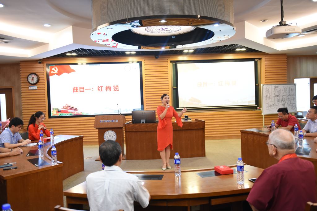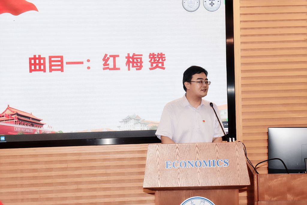 这堂音乐党课以历史年代为横轴,经典红歌为坐标,通过“讲述党史+演唱红歌”的形式,把党史和音乐融为一体,通过一段段党史讲解,一首首经典旋律,串起一条清晰的时代线索,生动立体地展现中国共产党100年来波澜壮阔的历史画卷。金融系教师党支部赵正堂副教授主讲本堂党课,特邀国家二级独唱演员、一级编导,青年歌唱家刘诗雨老师现场演绎《红梅赞》《沂蒙颂》《唱支山歌给党听》《江山》4首经典红歌。