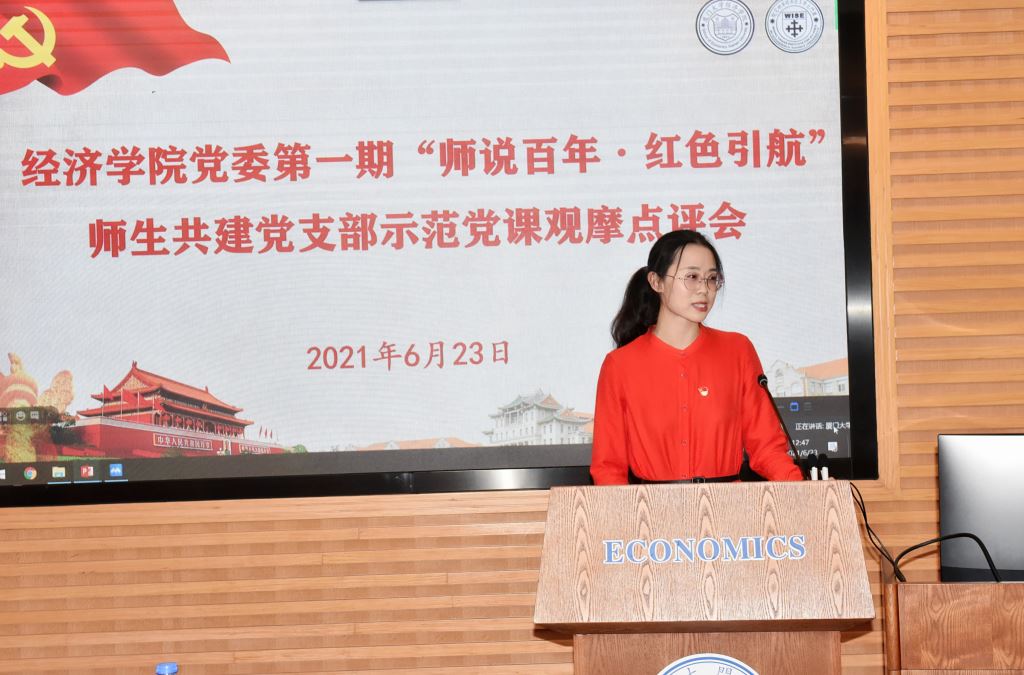 “师说百年·红色引航”师生共建党支部示范党课观摩点评会是继“师说·生语”师生共建党支部理论学习观摩点评会之后,经济学院党委精心打造的一个全新的党建工作平台,旨在通过展示师生共建党支部成员讲授创新型党课,更好地发挥教师党员的引领作用,继续推动师生党支部联学联建走向深入。下一步,学院党委将继续完善组织育人体系,创新组织育人模式,不断赋予组织育人工作以新的时代内涵。