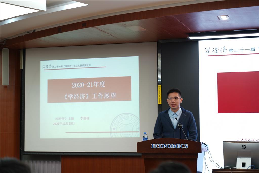 《学经济》编辑部执行主编崔畅同学介绍了《学经济》一年来的发展情况。这一年,《学经济》在构建思政教学阵地、打造前沿科研平台、结合新媒体传播手段等方面都取得了较大的发展和进步。截止11月23日,“经经有道”公众号研讨会推文突破100篇大关,总推文达354篇,累计阅读152571次,吸引89204人次阅读,形成了一定的规模和影响范围。其中,推出的视频板块更是得到了积极反响。同时,编辑部的学生培养也取得了卓越成果,2017-2021年保研率100%,2021年值班编辑分别去向北大、人大、复旦、浙大、南开等知名学府。最后,《学经济》也在为创建国内一流学生学术交流的媒体平台而不断努力。