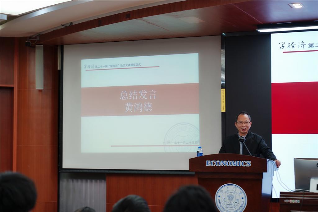 经济学院黄鸿德书记作总结讲话。他回顾了《学经济》的发展历程和厚重历史。指出和早期相比,《学经济》从学生内心世界出发,结合现代信息技术、以更加多样化的形式传播知识与思想,体现出经院师生“能文能武”的本领。期望在“学经济”论文大赛这个平台上,同学们能以发展的眼光更好地学习、继承、发扬马克思主义政治经济学优良传统,展现经济学子“经世济邦”担当。最后,他对获奖同学致以祝贺,并祝愿《学经济》越办越好!
