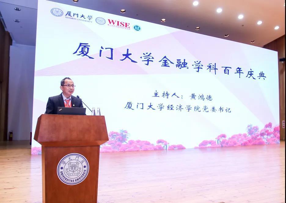 厦门大学金融学科百年庆典由厦门大学经济学院党委书记黄鸿德主持,厦门大学党委常委、副校长杨斌教授,中国金融学科终身成就奖、厦门大学南强杰出贡献奖获得者张亦春教授,福建省人大常委会党组书记、副主任雷春美,厦门大学经济学院、王亚南经济研究院副院长(主持工作)周颖刚教授先后致辞。