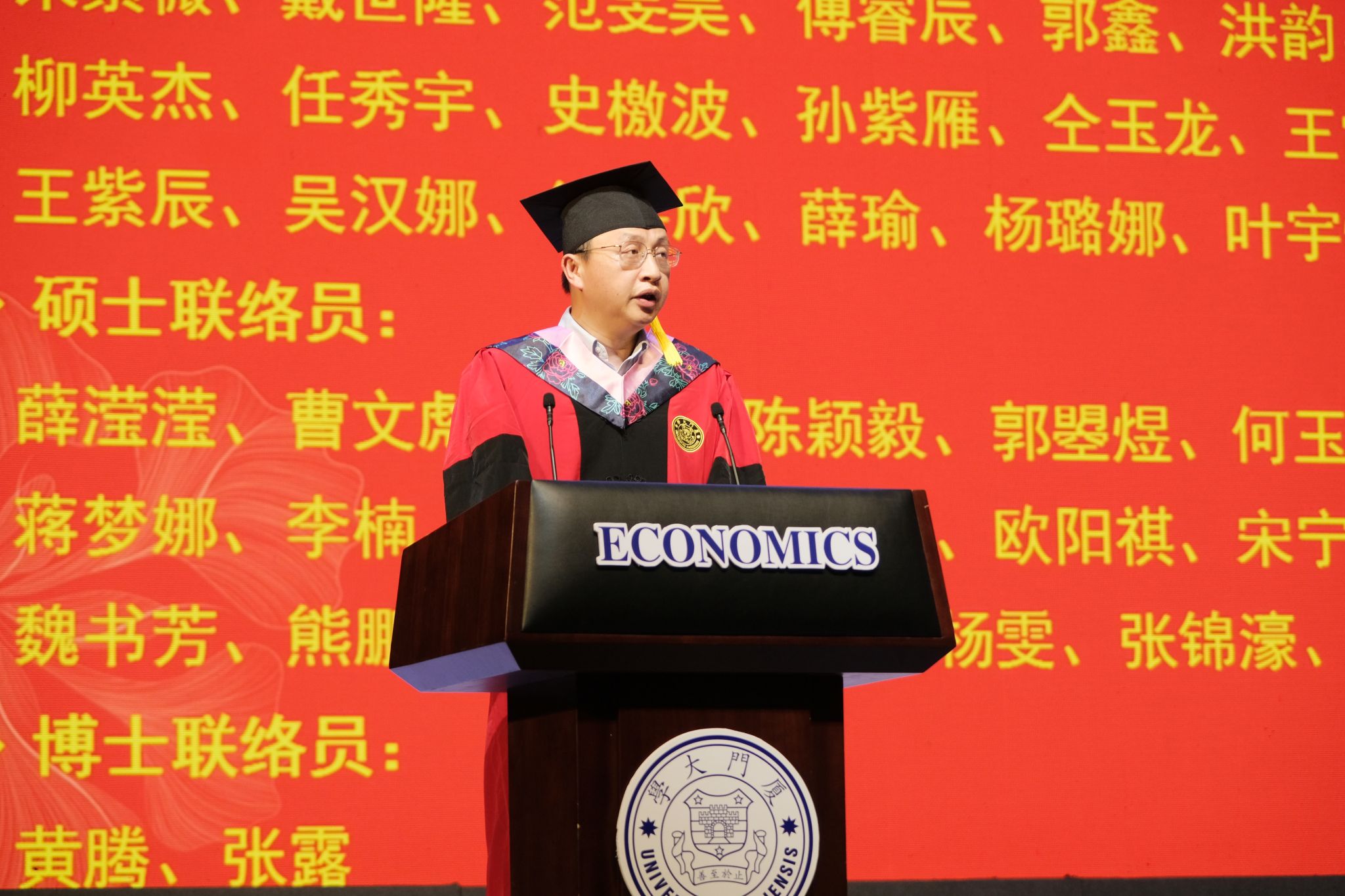 经济学院、王亚南经济研究院副院长(主持工作)周颖刚首先致辞,他代表经济学科全体老师,为1117名毕业生们送上诚挚的祝贺,并提出三点期望和叮嘱:一、希望同学们洞察大局,顺势而为。把自己发展的“小目标”融入世界百年未有之大变局和中华民族伟大复兴这“两个大局”;二、希望同学们记得青春里那个愿意奋斗的自己,让“自强不息”的校训和“自讨苦吃”的精神助力经济学子行稳致远;三、希望同学们心怀感恩,主动作为,回馈家庭、母校、社会,让嘉庚精神不断延续传承。