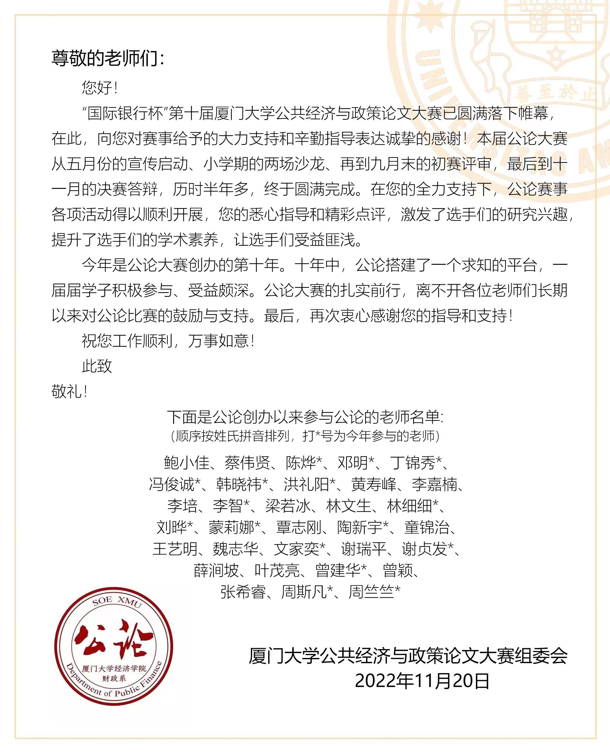 厦门大学公共经济与政策论文大赛已走过十年路程,每一届都凝聚了评委老师、参赛学生、工作人员的辛勤与汗水,也吸引了越来越多不同学院、不同专业本科生的关注和参与。