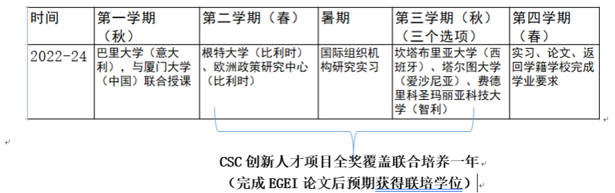 为培养和储备国际化复合型高端人才,更好地传播中国声音,参与国际组织事务,提升中国在国际上的话语权与合作共赢空间,在中国留学基金委员会(CSC)提供的全奖支持下,厦门大学经济学科将为研究生提供参与经济全球化与欧盟一体化(EGEI)欧盟联合硕士培养的机会。