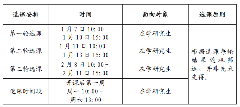 1.每轮选课结束约8小时后可查看选课结果或退课,前三轮选课期间可选可退,退课时间段只可以退课,退课截止日期(2月18日13:00)后不可退课;